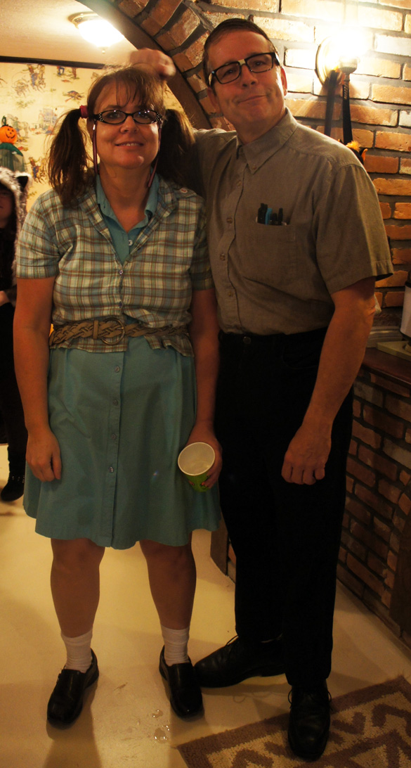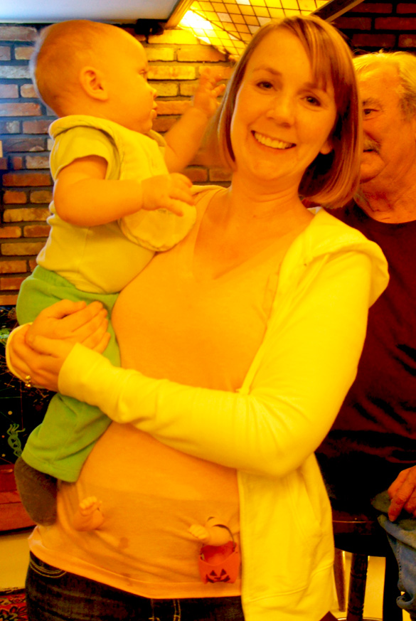 Thanksweenie was so much fun. Great news from newlyweds Jessica and Josh - they are expecting a baby in May. Her clever costume (see baby arms with Halloween basket protruding from her belly area below) alerted all of us to the great news. Our Thanksgiving dinner, oh my. I haven't eaten like that in months. The turnip applesauce casserole I made was a hit (who would have thought?). And Tonya made a chocolate cobbler that was wicked good.